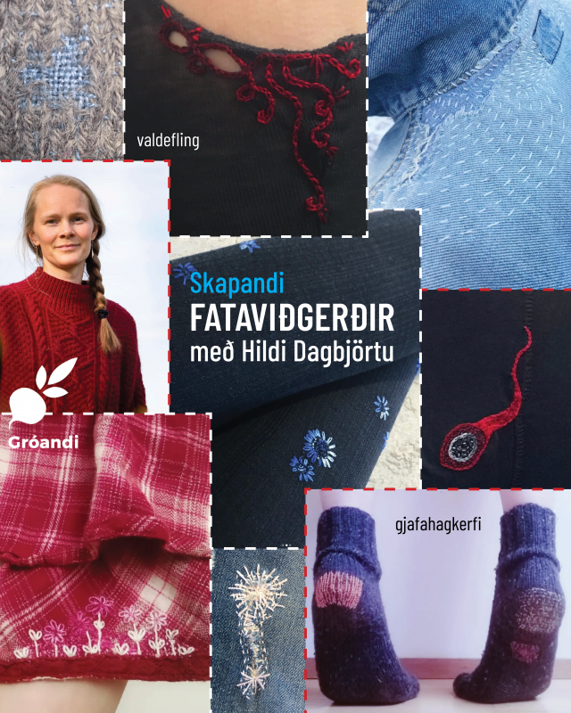 Endilega taktu með flík sem þú vilt gefa lengra líf. Einnig verða flíkur á staðnum fyrir þau sem vilja taka þátt en hafa ekki flík meðferðis. Leiðbeinandi er Hildur Dagbjört en hún býr yfir áralangri reynslu af allskyns fataviðgerðum, og hefur sérlega mikla unun af sýnilegum fataviðgerðum sem sýna með stolti að þessi flík býður hraðtísku og skipulagðri úreldingu (e. planned obsolescence) birginn.